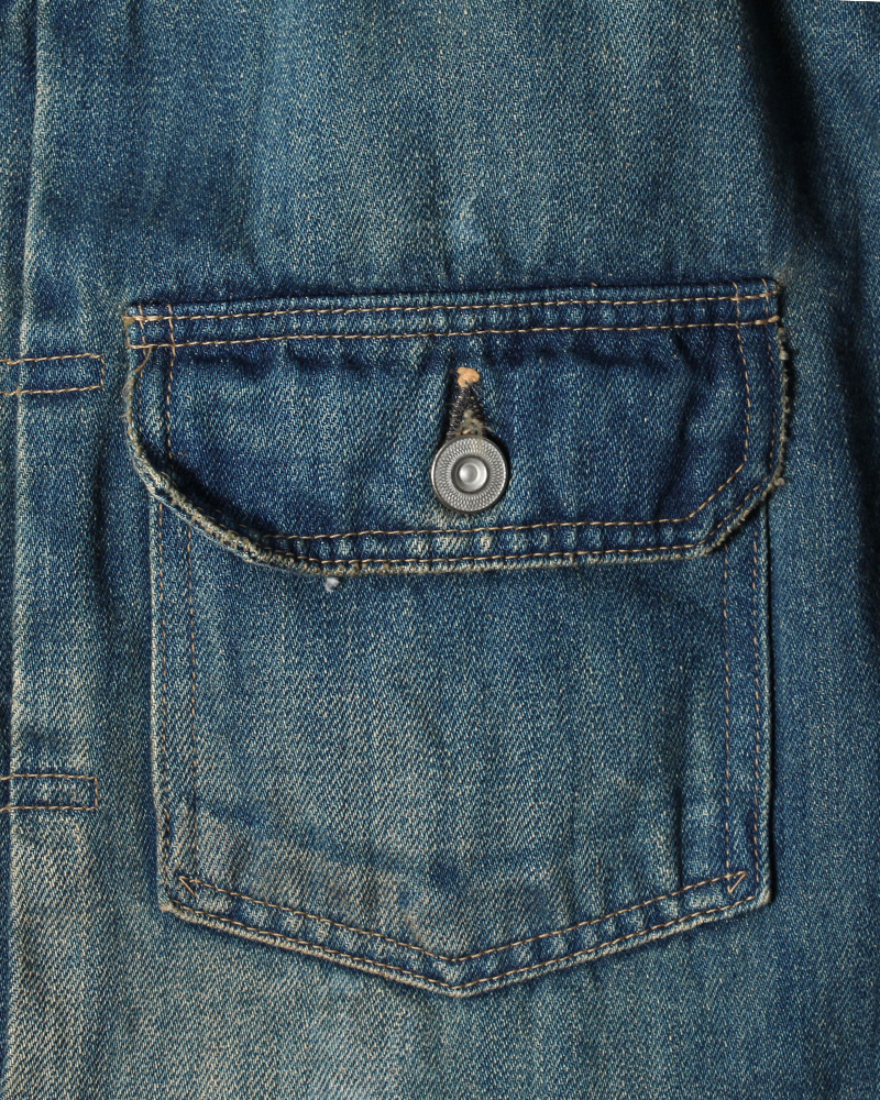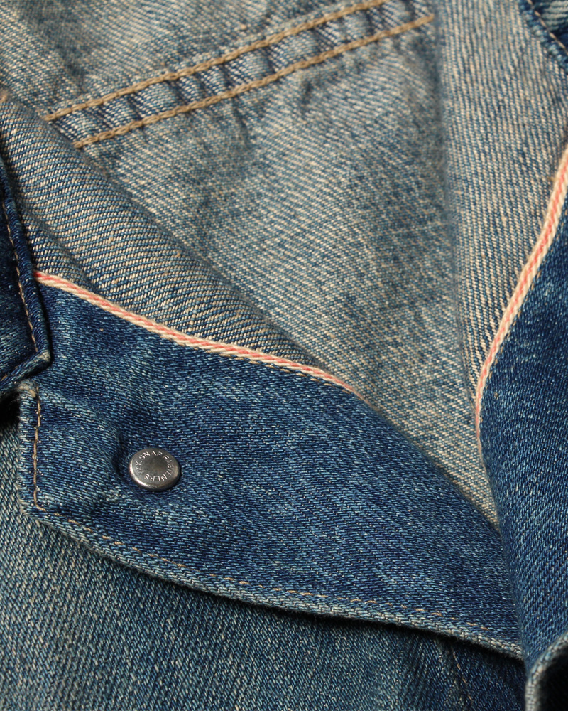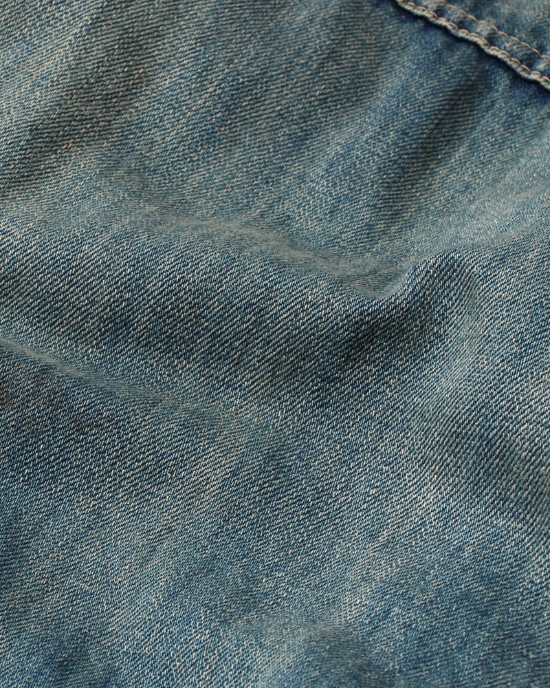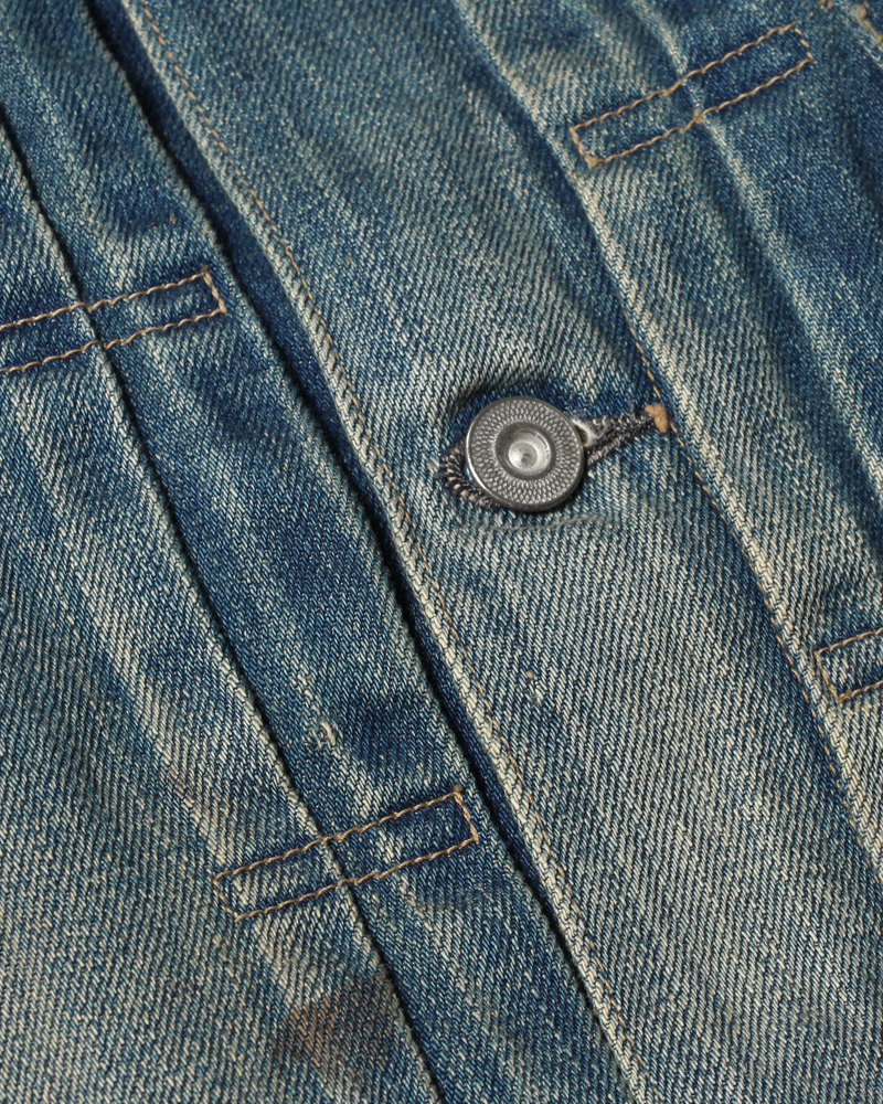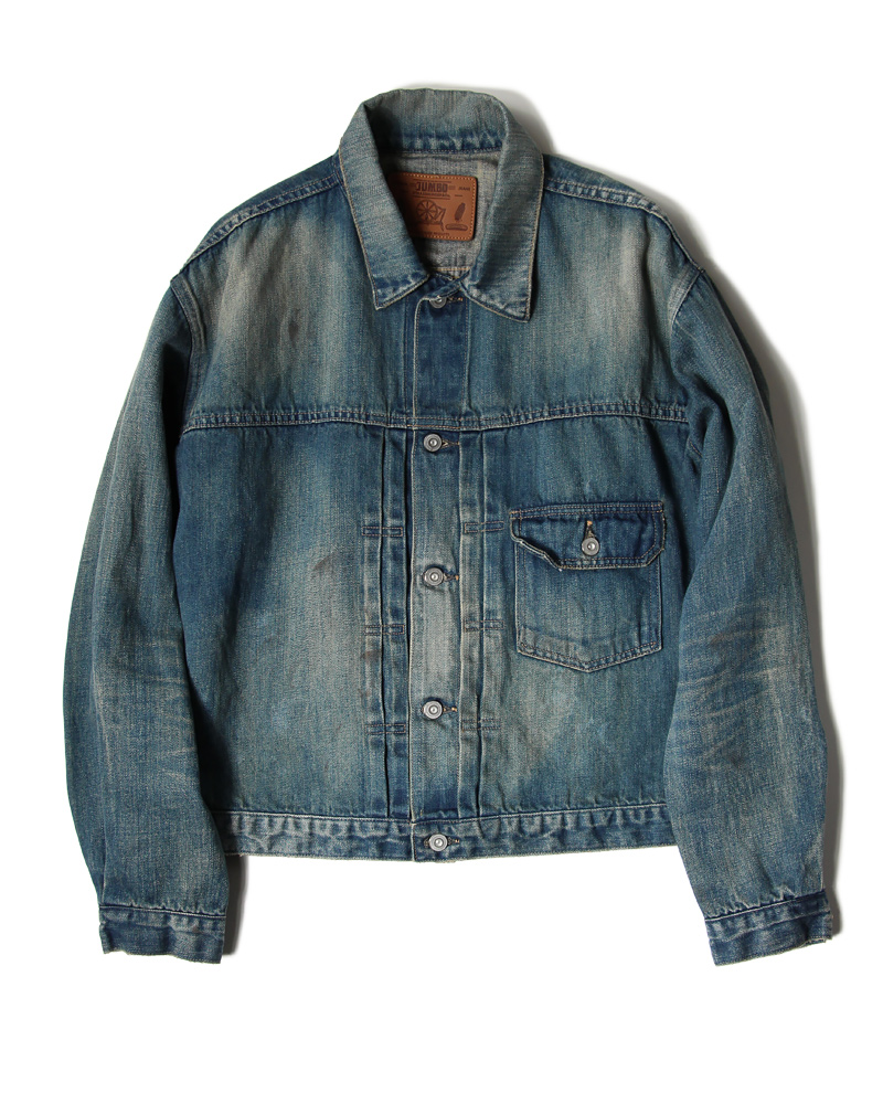 デニム加工の技術により、リアルなエイジングを再現したデニムジャケットです。通常の着用では色落ちさせるのは難しいデニムジャケットを加工職人の手により、長年着用したかのような風合いを作り出した逸品です。擦りによる色落ちの個所や加減など、長年の経験によって施されるデニム加工の技術は職人技と呼べる芸術にも似た日本が誇る手仕事です。。