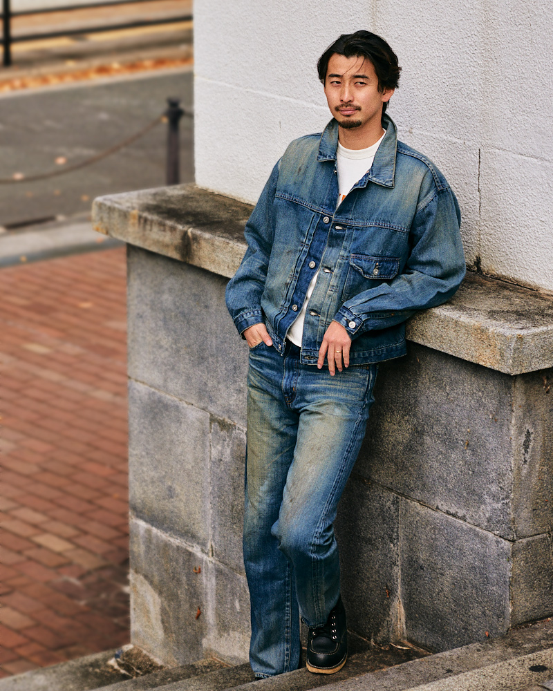着用したその日からすでに長年使用した風合いで楽しめるエイジング加工デニムジャケットです。同じSALLY FOXを使用した色落ち加工ジーンズとともにセットアップで着用いただけます。