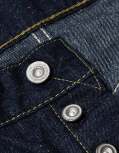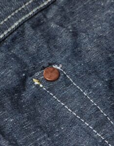 ネップデニムに映えるバナナイエローの縫製糸。同じデニムを使用したカバーオールともセットアップで着用いただけます。