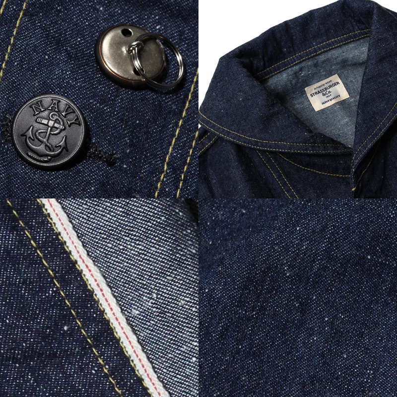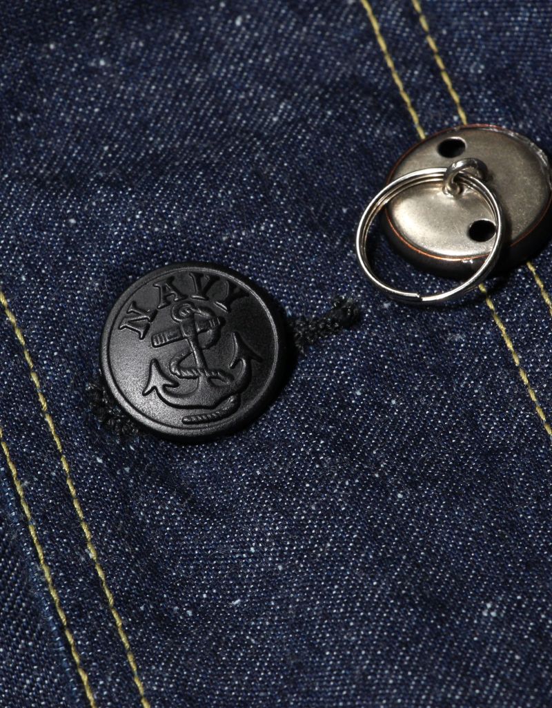 当時の仕様を踏襲し、ボタンホールにはヴィンテージ特有の菊穴を再現。フロントにはUS NAVYの象徴であるイカリマークを刻印したチェンジボタンを採用し、ディテールからも本格的な雰囲気を味わえます。