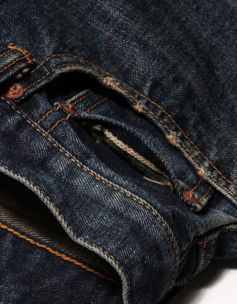 ヴィンテージのディテールを随所に再現し、隠しリベット、V字ステッチ、中盛りベルトループ、コインポケットにはセルビッチの耳を配し、しっかりと作り込んだ一本に仕上げています。