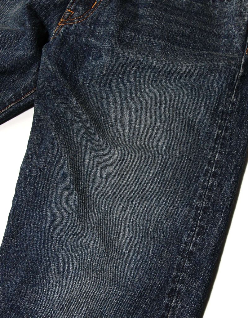 3年着用したかのようなリアルなエイジングを再現し、穿き始めから自然な色落ちを楽しめる一本です。フロントはジップフライ仕様、革パッチには経年変化が楽しめるディアスキンの革パッチを採用しています。