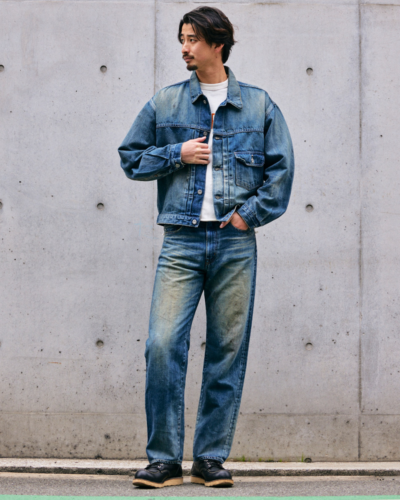 JUMBO 14.5ozセルビッチデニムを使用した定番“222”ストレートシルエットの加工モデル。