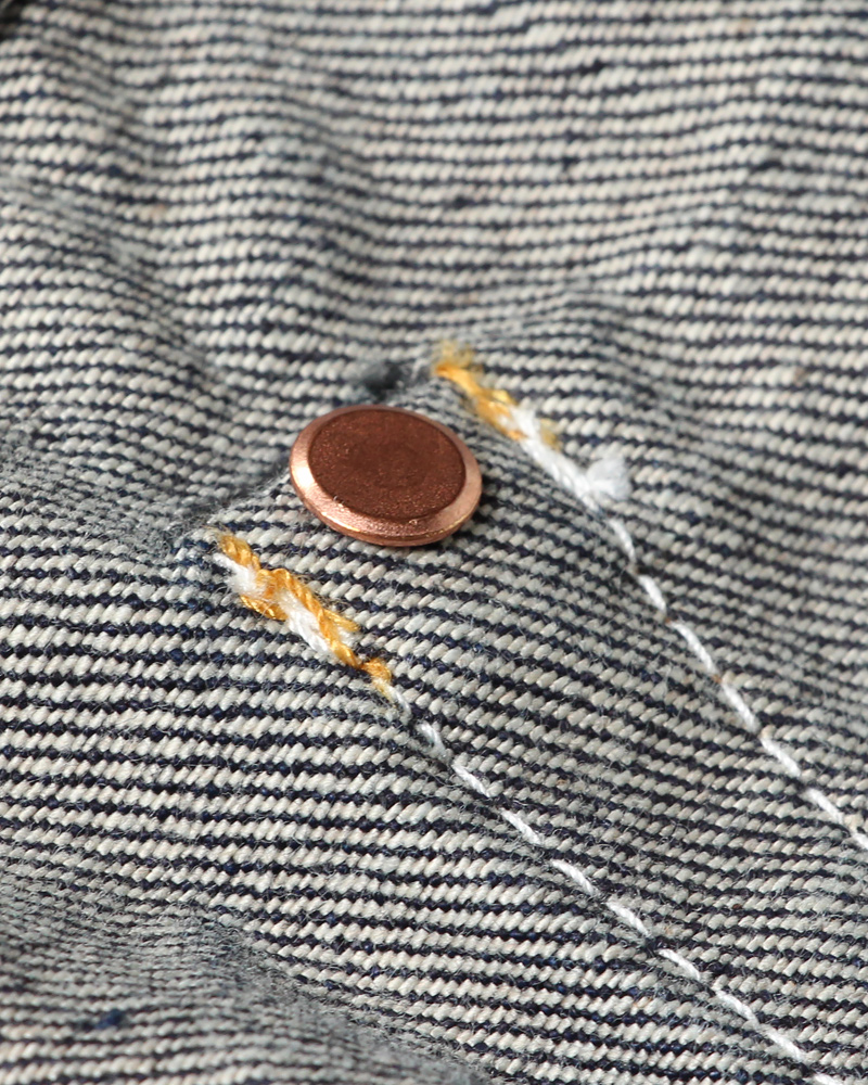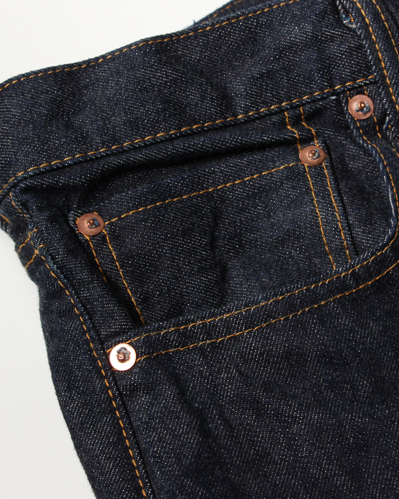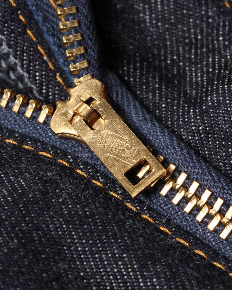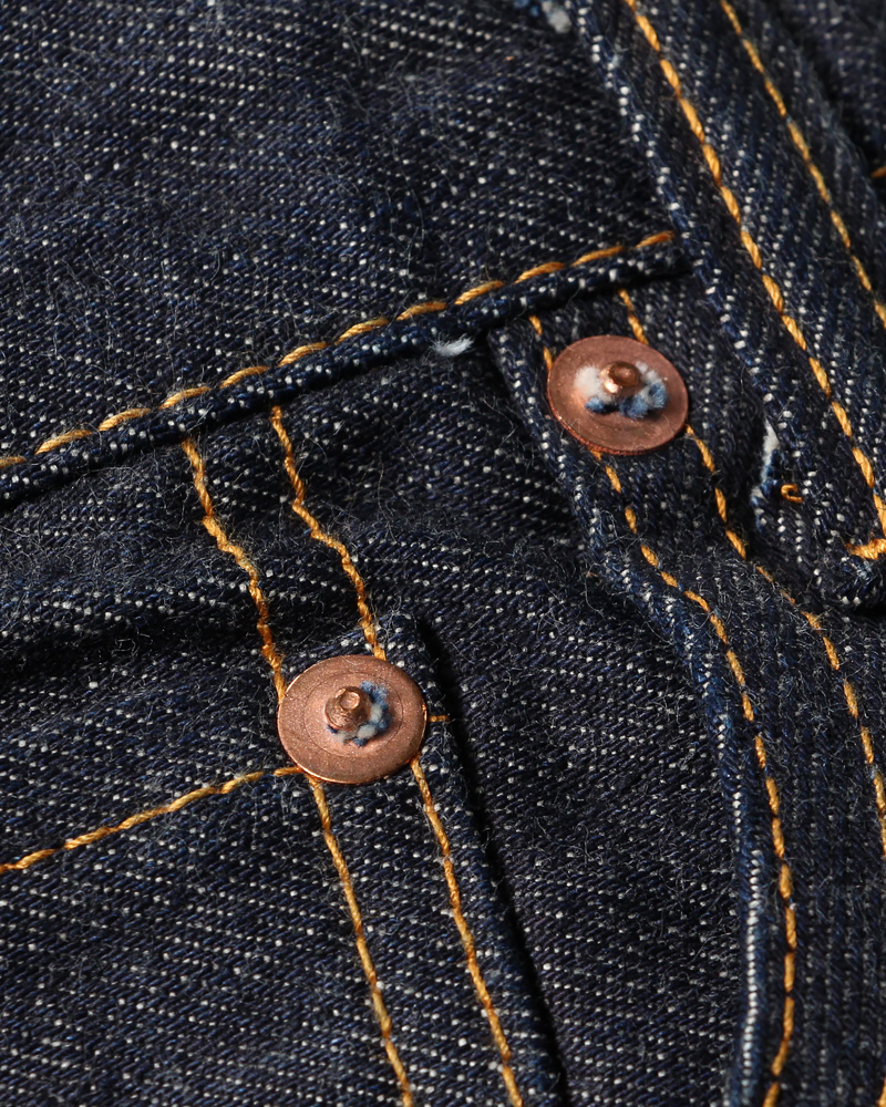 隠しリベットや色落ちするコアヤーン縫製糸、ディアスキン革パッチなど、本格的なヴィンテージディテールも併せ持ったアイテムです。