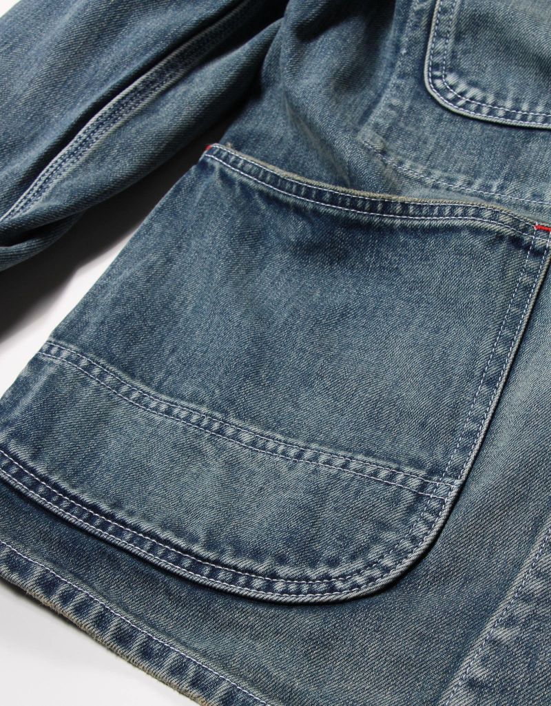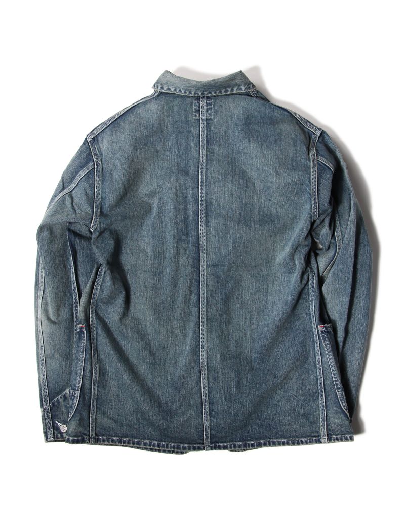 ヴィンテージのストア系ブランドをカバーオールを現代的なシルエットにリデザインしたデニムカバーオール。アメリカのワークウェアが日常着として使用されていた時代の気負わず羽織れる佇まいを踏襲しながら、着丈や身幅、肩まわりのバランスを見直すことで、今のスタイルにも自然に馴染む一着に仕上げました。